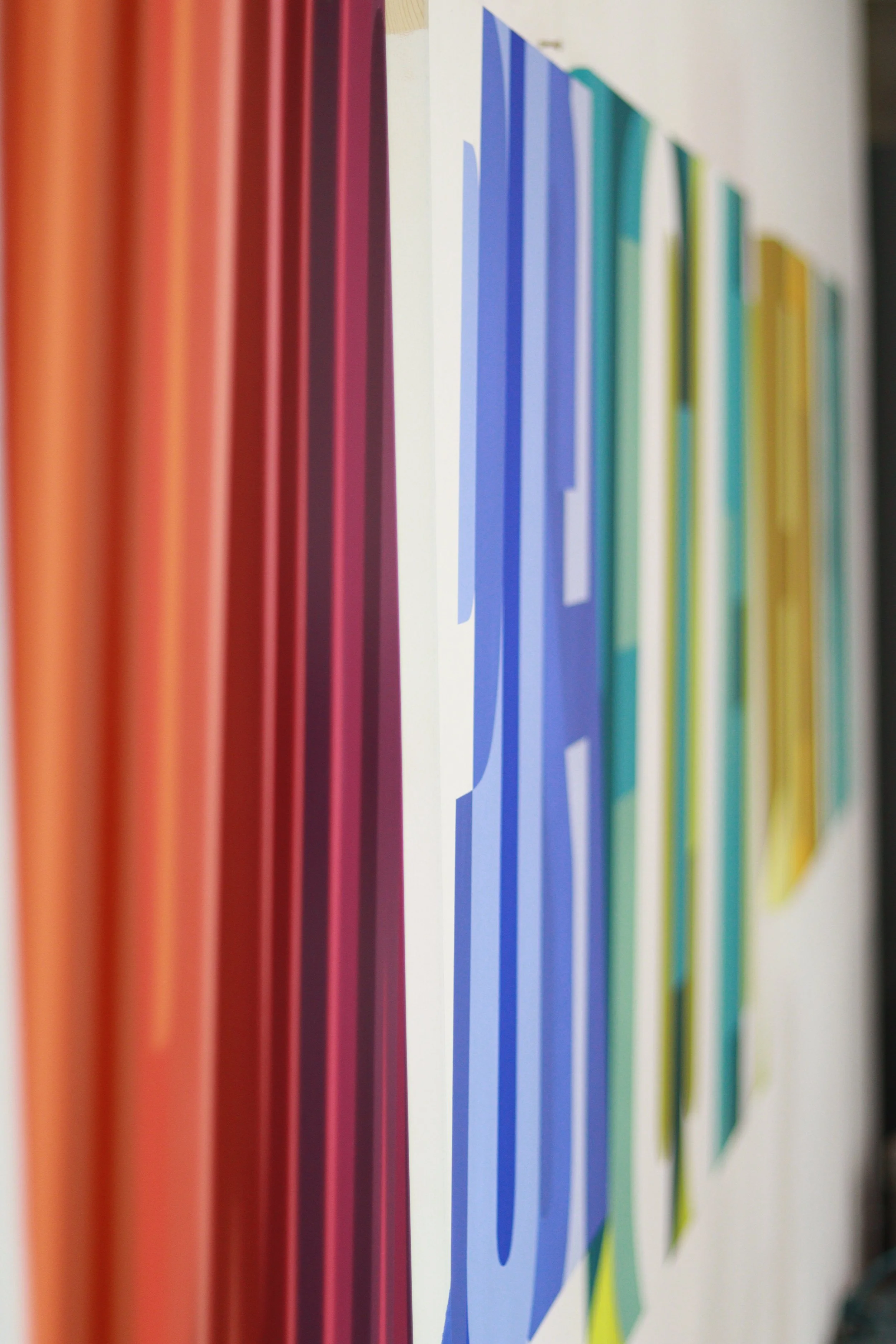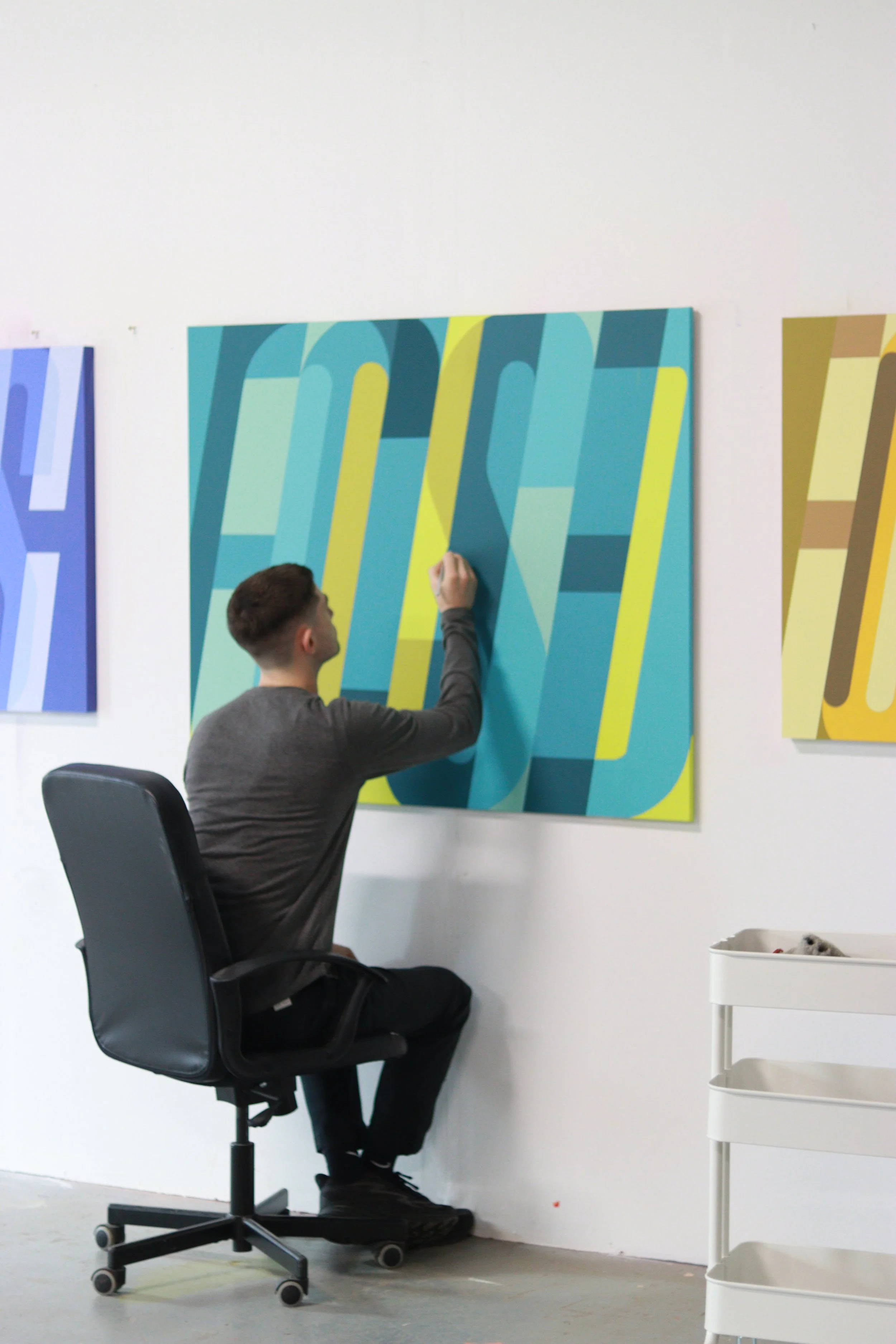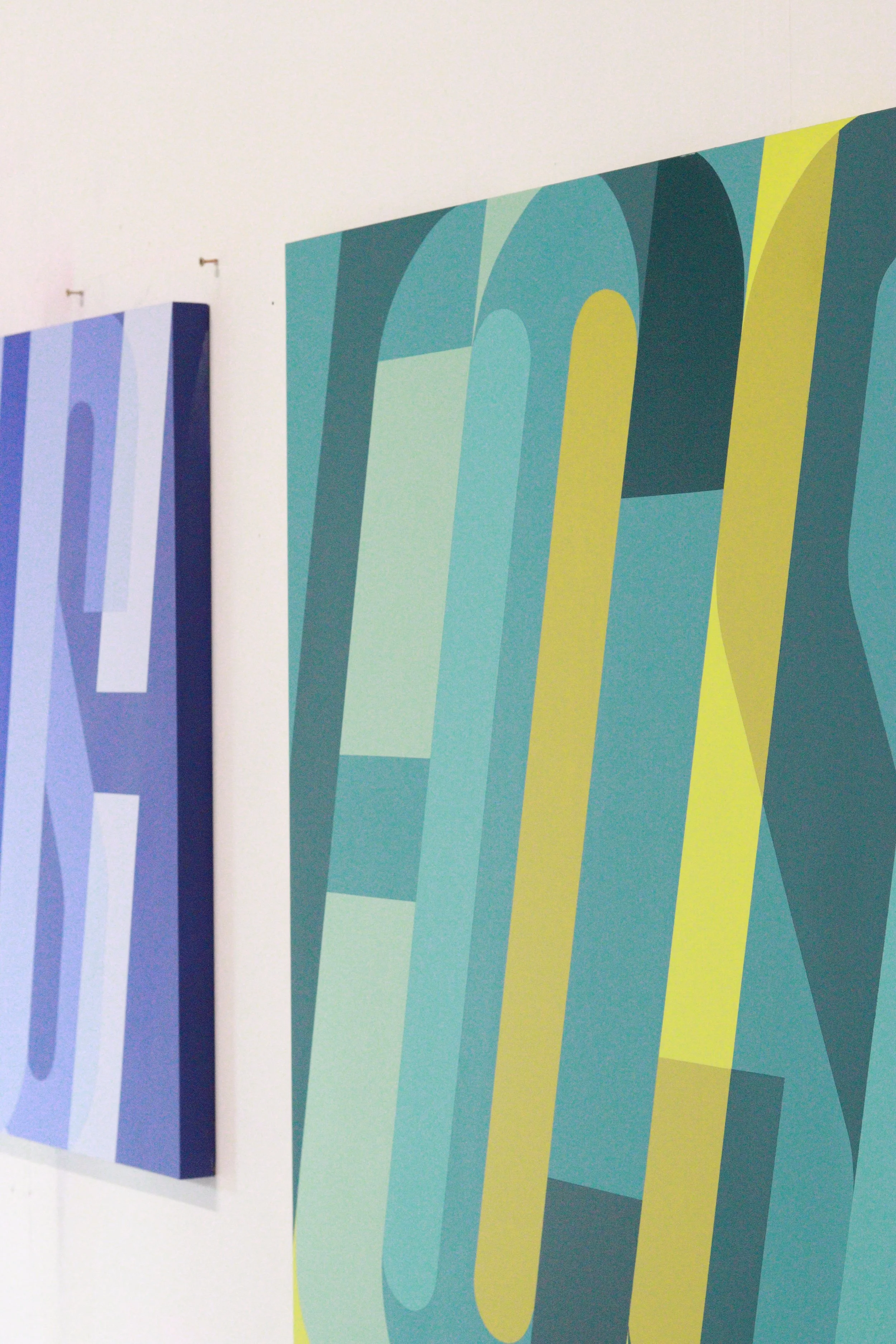 Sean uses the base of typography in his work as a method of communication. He creatively abstracts the rigid forms and shapes of graphic lettering to develop his own visual language. This visual language is represented through a series of hand painted overlays that result in a geometric landscape for viewers to decode.